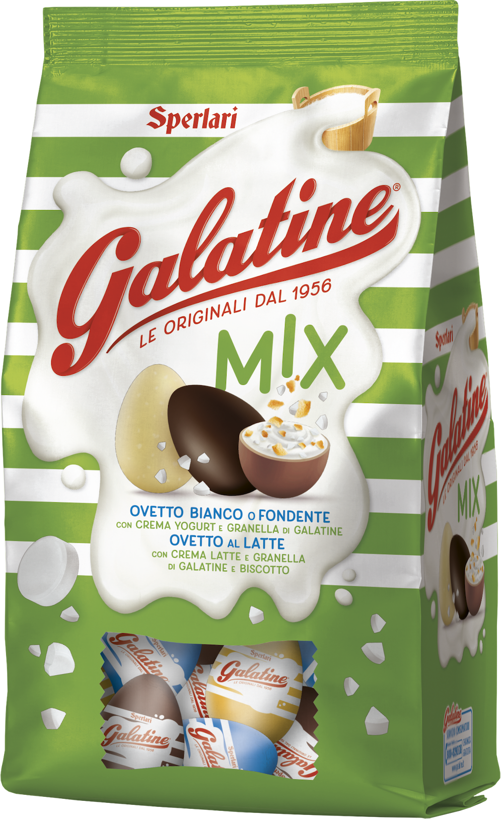 Da oggi l’ovetto Galatine in tre irresistibili varianti per tutti i gusti! Guscio di cioccolato al latte o fondente ripieno con crema al latte e l’inconfondibile granella di Galatine. E per chi cerca una combinazione di sapori ancora più golosa: ovetto di cioccolato al latte, crema al latte, granella di Galatine e biscotto.